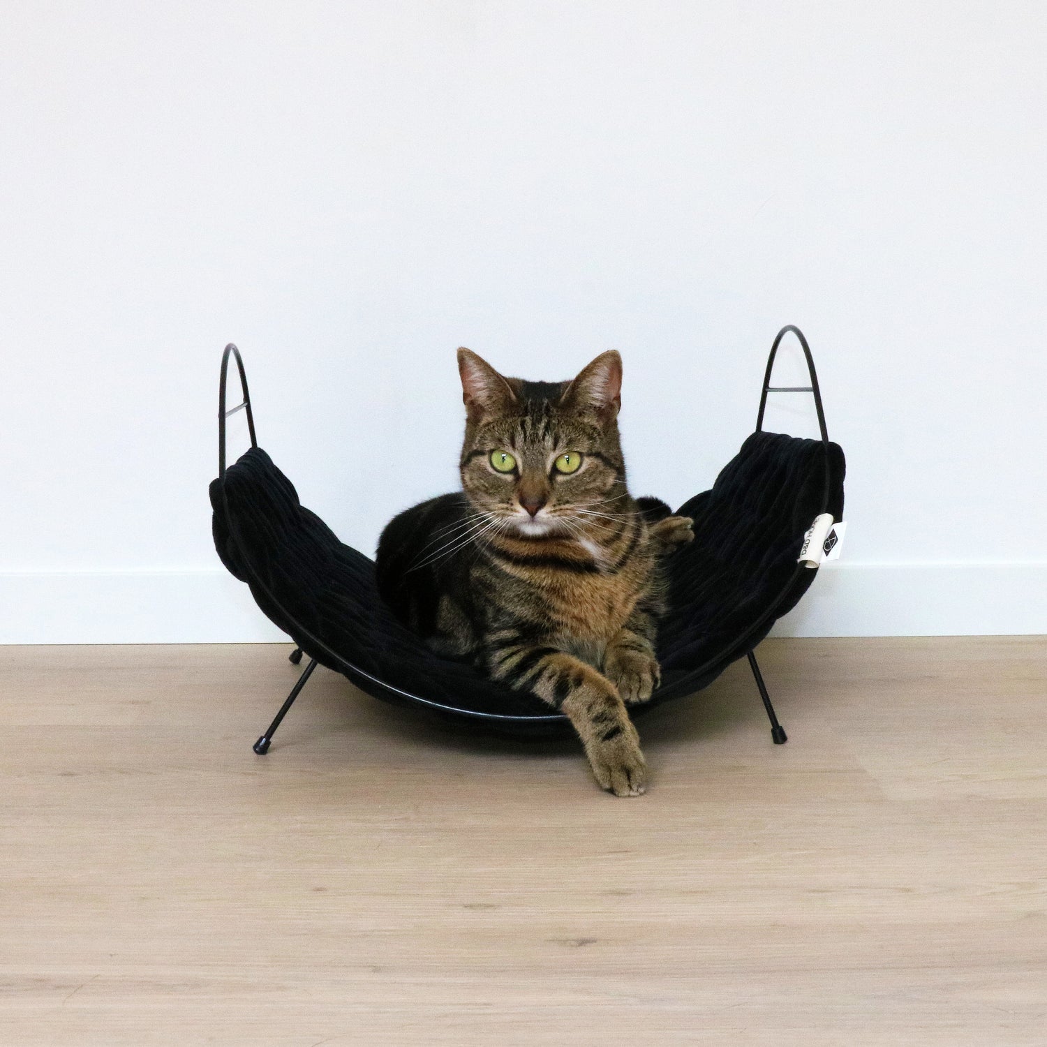 Baily est un lit pour chats élégant et original de D&D HOME, fabriqué en fil métallique noir. Un lieu de repos surélevé pour votre chat, idéal pour les chats qui veulent tout surveiller dans et autour de la maison. Un tissage de polyfibre noire et de corde molletonnée autour du fil métallique forme la zone de couchage souple du panier. Super doux, beau et confortable. Le nouvel endroit préféré de votre (vos) chat(s) ! Le lit repose sur des pieds munis d'embouts en caoutchouc pour ne pas endommager le sol. Poids maximum : 10 kg.