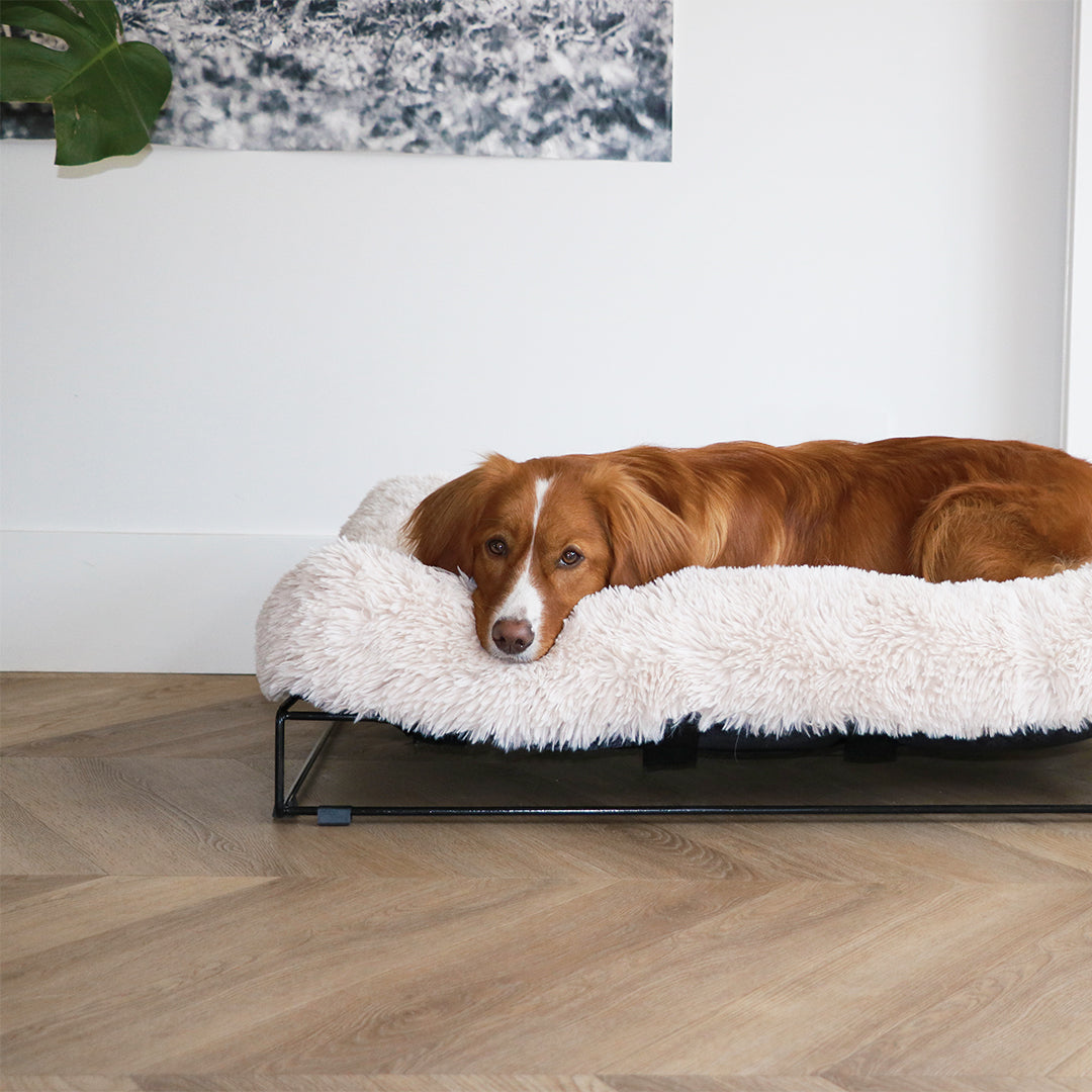 Hondenkussen Amy is een bijzonder zachte en comfortabele ligplek voor jouw hond of kat. Het kwalitatieve kussen heeft een tijdloze uitstraling en past perfect in ieder interieur. Het kussen is gevuld met memory foam vlokken waardoor het kussen zich helemaal naar het lichaam van je hond kan vormen en ondersteuning biedt om gewrichtspijn te voorkomen of verlichten. Memory foam of traagschuim heeft als eigenschap dat het vormvast is en weer in zijn oorspronkelijke vorm terugkeert. De hoes is bovendien wasbaar. Dit kussen wordt geplaatst op een zwart metalen frame met nopjes om de vloer te beschermen. Ook de frame past zich aan aan het lichaam van jouw dier.
