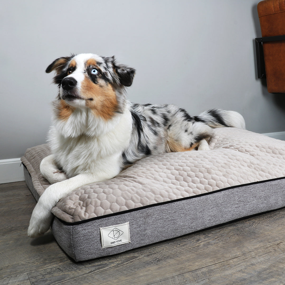 D&D Home kussen Celia is een innovatief en ergonomisch hondenkussen. Het kussen bestaat uit 2 verschillende binnenkussens waardoor het extra ondersteuning biedt voor de gewrichten. Het onderste kussen bestaat uit een 7cm dik schuim en een 3cm dikke memoryfoam bovenlaag. Boven op het schuimkussen hebben we een topper geïntegreerd die voor extra ondersteuning en comfort zorgt. Er ontstaat een lekker warm en geborgen nestje waar je hond zich in kan nestelen. Memory foam heeft als eigenschap dat het vormvast is en weer in zijn oorspronkelijke vorm terugkeert. De kussenhoes is gemaakt van een zachte fluwelen stof, met een grafisch stiksel erin, gecombineerd met een hoogwaardig gewoven interieurstof aan de zijkant. Door de contrasterende, zwarte bies is het kussen gedetailleerd uitgewerkt. De hoes is uitwasbaar en doordat er ook een gewoven binnenkussen aanwezig is, gaat deze veel langer mee wanneer het vaker in en uit het kussen wordt gehaald. Door het gewicht van het kussen en de anti-slip onderkant, zal het niet snel verschuiven.