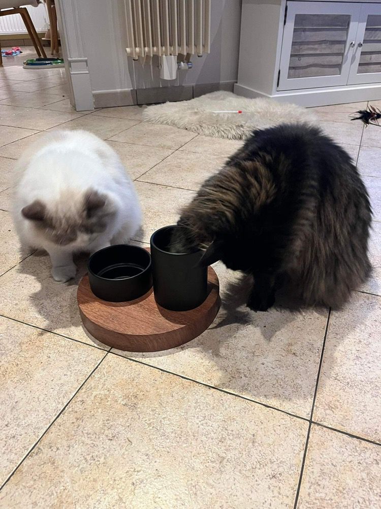 De slow down verrijkingskom IGGY van D&D Home | I LOVE Happy Cats is ontworpen in samenwerking met kattengedragstherapeut Anneleen Bru. Deze mooie design verrijkingskom met 3 kommen van verschillende hoogtes stimuleert je kat om op een speelse manier te eten en doet haar ook trager eten, wat goed is voor haar lichamelijk en geestelijk welzijn. Het voedsel op meerdere plaatsen in huis aanbieden met verfijnde kommen zoals de IGGY is goed voor je kat en voorkomt verveling, stress en overgewicht. De stijlvolle artisanale keramische kommen staan op een houten schijf die hen stabiel houdt wanneer je kat haar poten gebruikt bij het eten. De beschermstippen onderaan voorkomen krassen op de vloer en houdt IGGY op zijn plaats.
