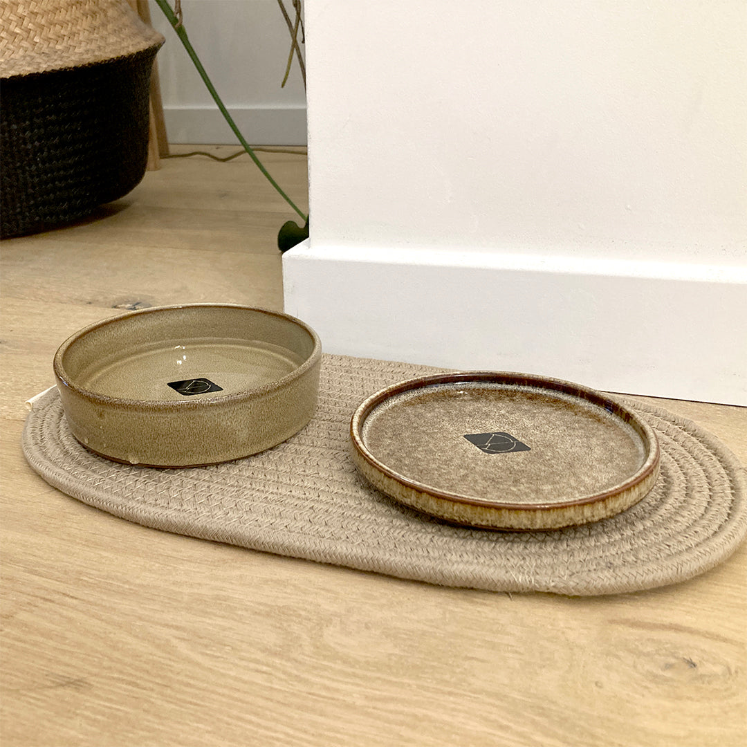 De Jasper eet- en drinkkom van D&D HOME is een uit keramiek vervaardigde schaal afgewerkt met een eigentijds glazuur. Katten vinden het niet fijn dat hun snorharen de randen van de kom aanraken. Deze kom is met deze insteek speciaal ontworpen voor katten. Met een wanddikte van ongeveer 8mm kan de Jasper wel tegen een stootje. De onderkant van de kom is voorzien van rubberen nopjes om krassen op de vloer tegen te gaan.