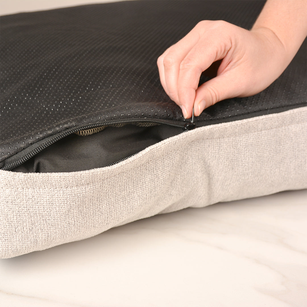 D&D Home kussen Maddy is een stijlvol hondenkussen gevuld met memoryfoam vlokken waardoor het kussen zich helemaal naar het lichaam van je hond kan vormen en ondersteuning biedt om gewrichtspijn te voorkomen of verlichten. Memoryfoam heeft als eigenschap dat het vormvast is en weer in zijn oorspronkelijke vorm terugkeert. De kussenhoes is gemaakt van interieurstof waarin 2 contrasterende kleuren zijn gebruikt om een grafisch patroon weer te geven. De hoes is uitwasbaar en doordat er ook een gewoven binnenkussen aanwezig is, gaat deze veel langer mee wanneer het vaker in en uit het kussen wordt gehaald. Door het gewicht van het kussen en de anti-slip onderkant, zal het niet snel verschuiven.