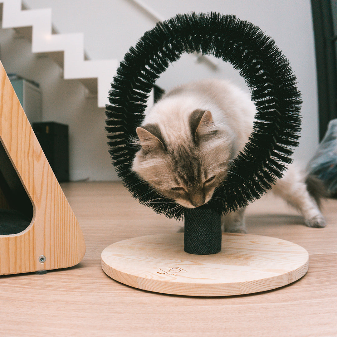 D&D Home Mila is een massageborstel voor je kat. Door zijn ringvormige 360 graden borstel kan de kat ieder plekje van zijn lichaam bereiken om zijn klieren en vacht langs te strijken en het helpt ook los en uitvallend haar te verwijderen. Door het gebruik van massief berkenhout, interieurstof en de zwarte borstelharen krijgt het product een stijlvolle uitstraling die past in ieder interieur.