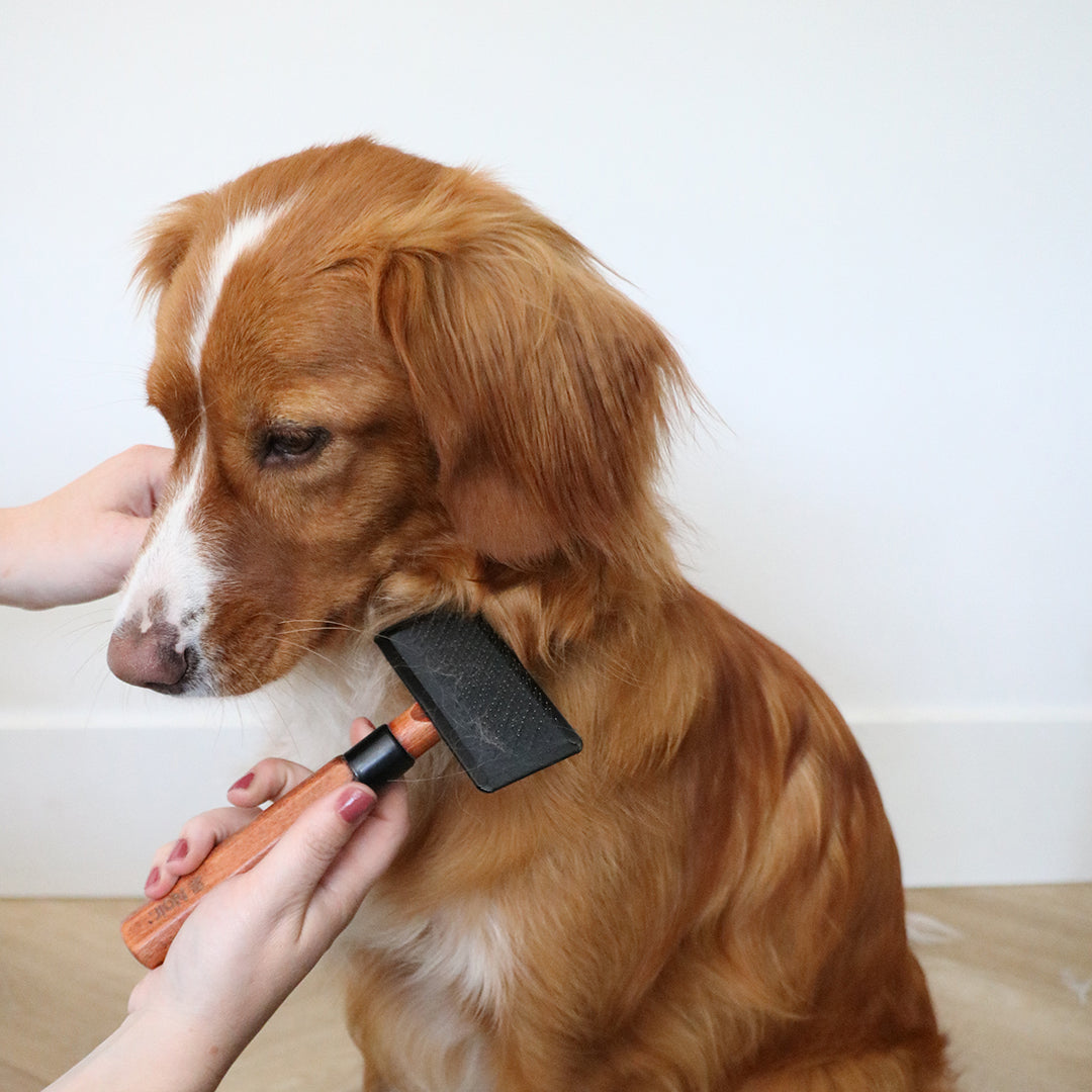 Deze zachte Slicker borstel van Noir Japandi is geschikt voor een goede basisverzorging het hele jaar door. Deze borstel met fijne gebogen pinnetjes wordt voornamelijk gebruikt om de vacht mooi en klitvrij te houden. Borstel jouw viervoeter regelmatig zo hou je de vacht glanzend, gezond en klitvrij. Deze borstel is geschikt voor alle vachttypes. De slicker is gemaakt van roestvrijstalen pinnen en heeft een ergonomische handgreep van FSC-gecertificeerd beukenhout met een donker gebeitste afwerking.
