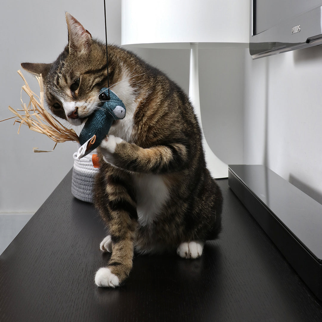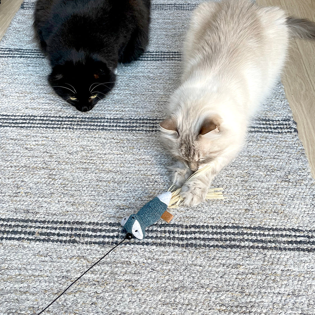 Deze leuke Rocco hengel van D&D HOME is gemaakt van mooie stoffen zoals chenille of corduroy en afgewerkt met een staart van stro. Met deze houten speelhengel met elastische koord & belletje kan je je kat extra stimuleren om samen met jou te spelen, waardoor hij fit en gezond blijft. Katten die te weinig beweging hebben kunnen sneller dik worden, waardoor er gezondheidsklachten kunnen optreden. Speelplezier gegarandeerd!