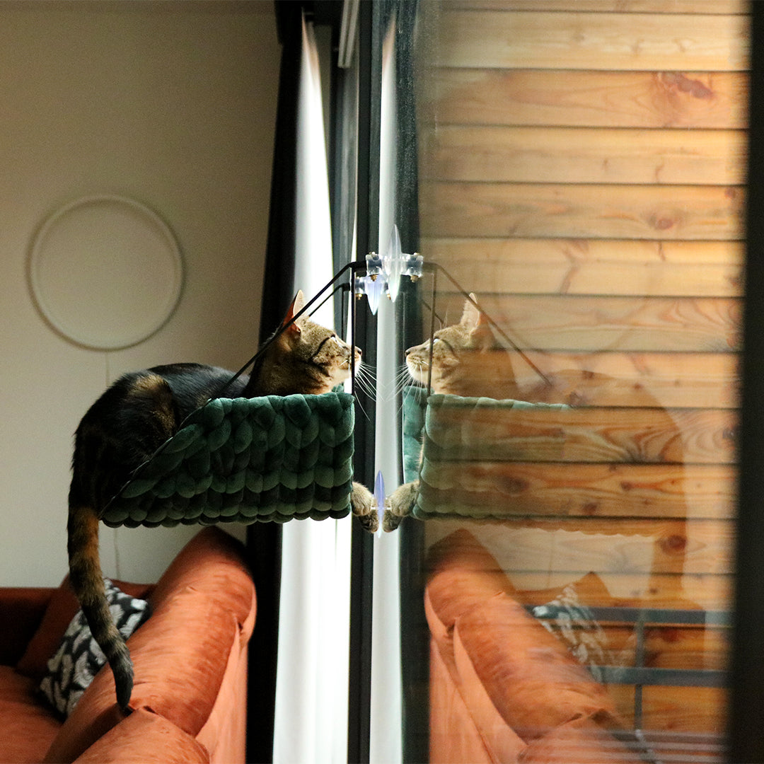 D&D Home Sofia is een modern en stijlvol kattenbed dat tegen het venster kan worden bevestigd, een verhoogde ligplek voor je kat. Ideaal voor katten die graag in en rondom het huis alles in de gaten willen houden. Het bed is gemaakt van een stevig metalen frame met 3 sterke zuignappen (max. draagvermogen 10kg). Het liggedeelte wordt gevormd door een gevlochten polyfiber katoentouw rond het frame. Katten liggen graag in de hoogte , het is een ideale uitkijkplaats voor de jacht. Voor een binnenkat is een hoog plekje in de buurt van een raam de perfecte plek om naar vogeltjes te kijken, het is een vorm van Katten TV.