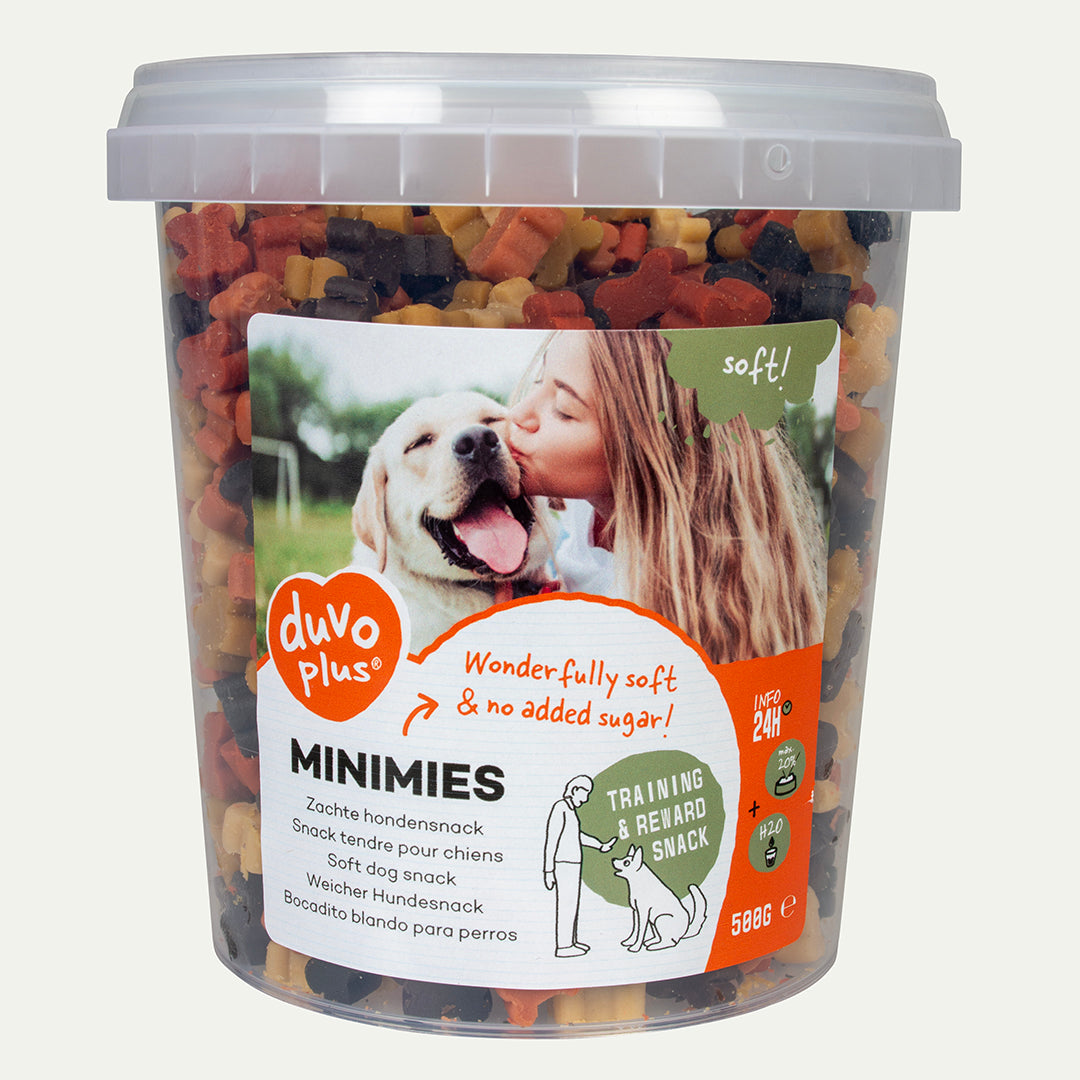 De heerlijke duvoplus soft! snacks maken honden en hun baasjes blij. Deze kleine en zachte snacks zijn perfect voor het trainen en belonen van puppy's en volwassen honden. Deze Belgische snacks zijn gemaakt van hoogwaardige grondstoffen zonder toegevoegde suikers. Bovendien zijn ze verpakt in een handige hersluitbare emmer van 100% recycleerbaar materiaal. Snacks dienen als aanvulling en variatie op het dagelijkse menu van jouw hond dus geef snacks altijd met mate.