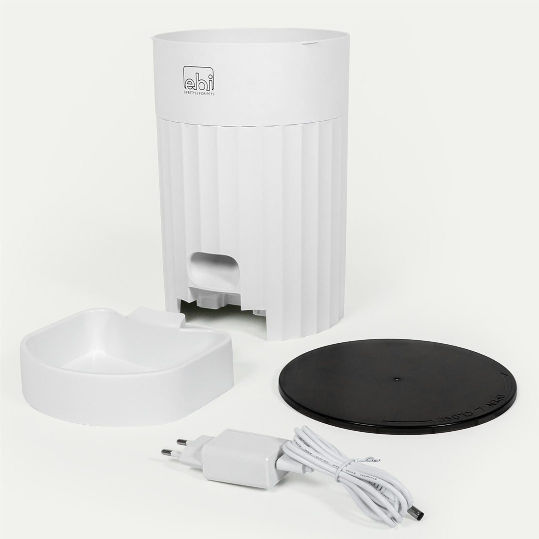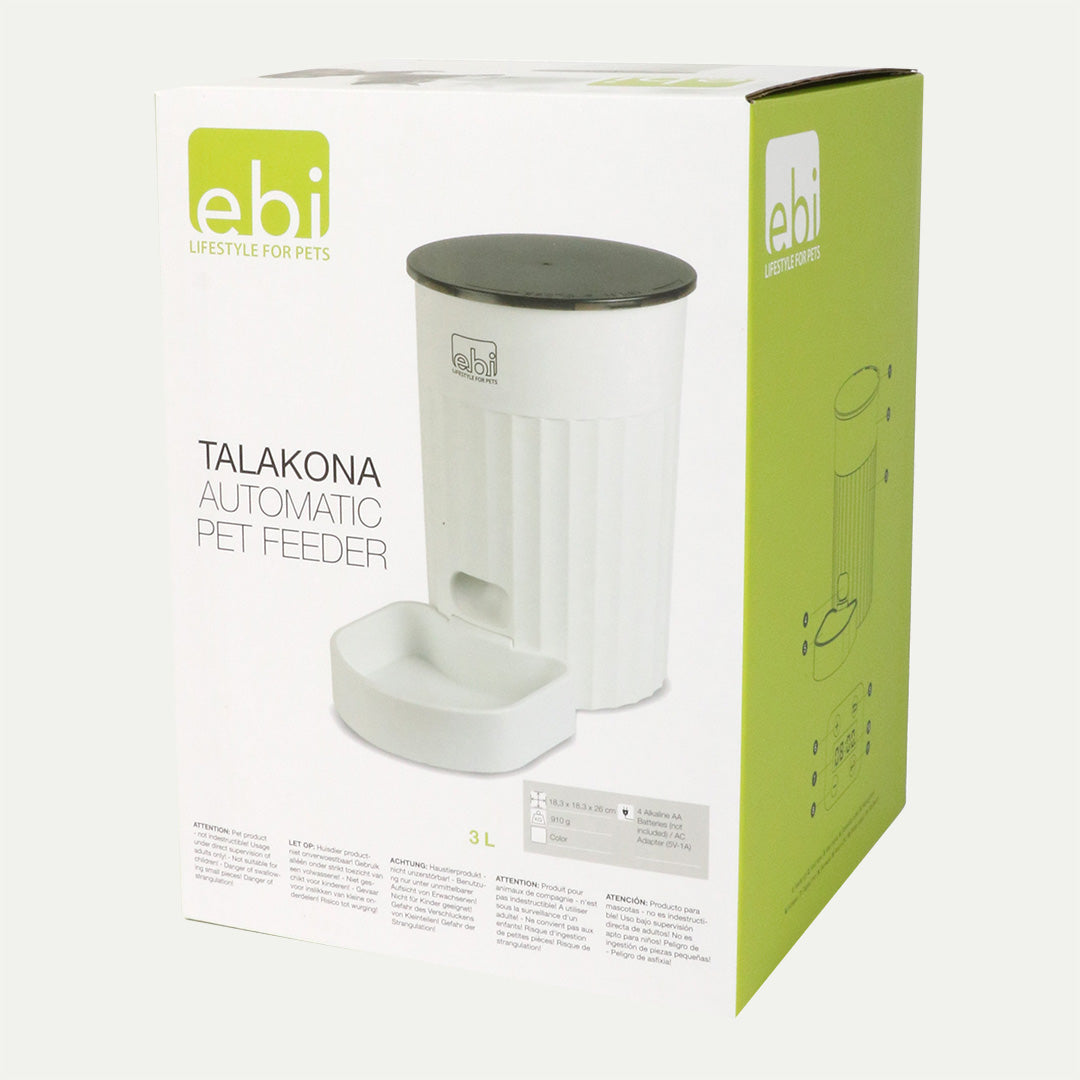 Talakona van EBI is een programmeerbaar voersysteem voor honden en katten, ideaal als je onverwacht een paar uur moet overwerken en je huisdier gewend is om op een vast moment eten te krijgen. Talakona heeft een inhoud van 3 liter en werkt met porties van 20 gram. Je kan tot 120g per portie geven, doseer op maat van je dier. Stel in hoeveel porties je huisdier krijgt en op welke tijdstippen. Je kan tot 4 tijdstippen per dag instellen.