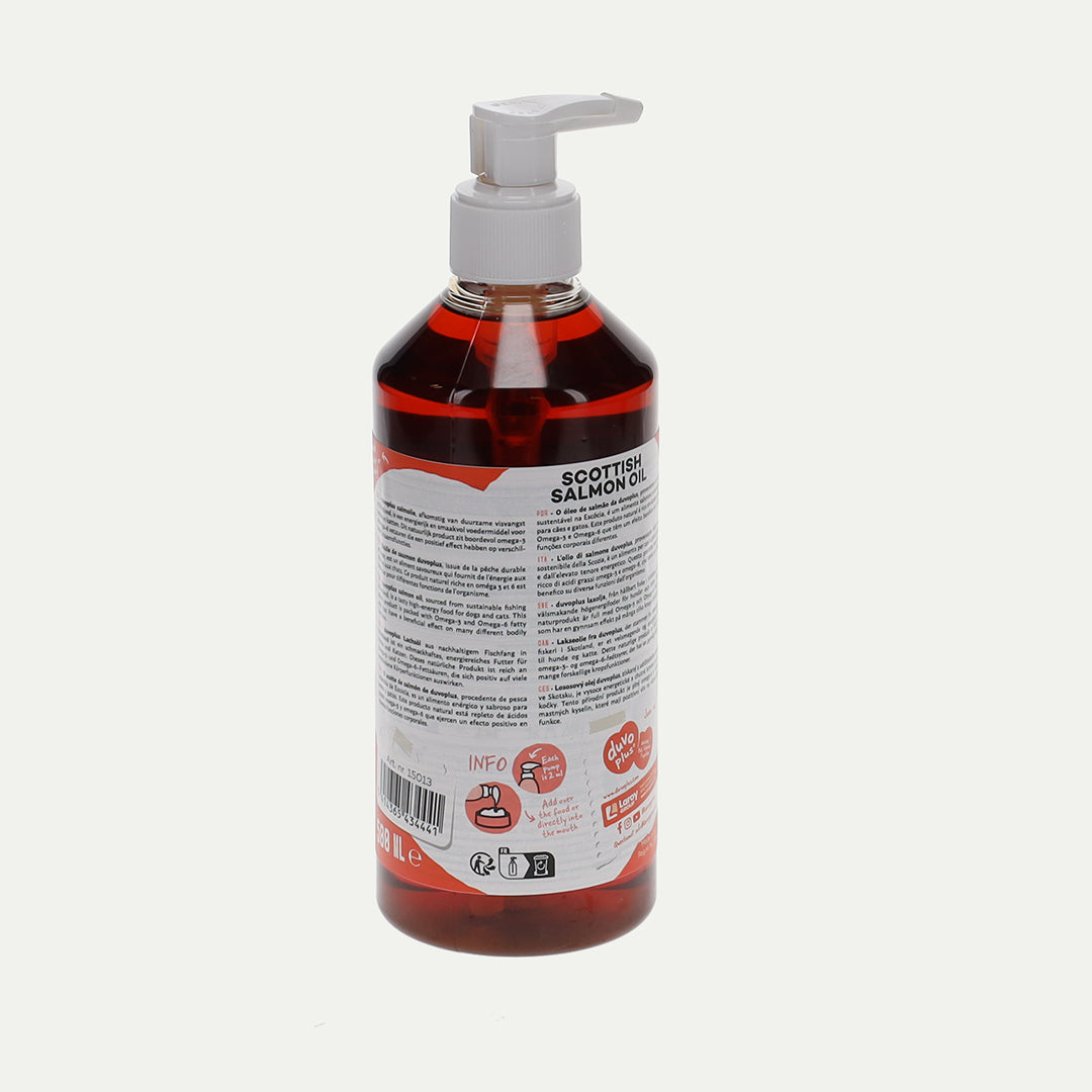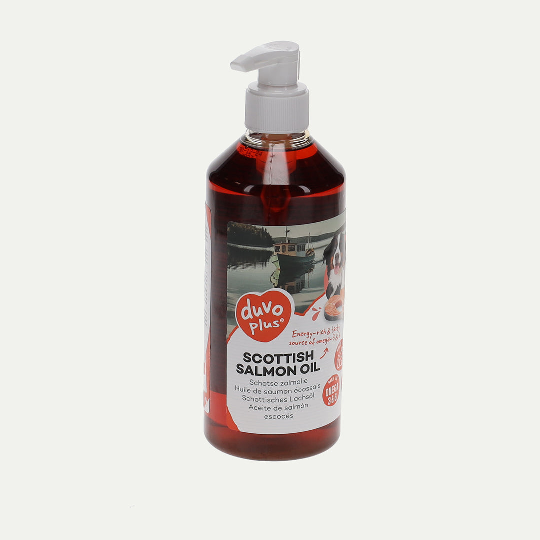 Zalmolie, afkomstig van duurzame visvangst uit Schotland, is een energierijk en smaakvol voedermiddel voor honden en katten. Dit natuurlijk product zit boordevol omega-3 en omega-6 vetzuren die een positief effect hebben op verschillende lichaamsfuncties. Zalmolie zorgt voor een glanzende vacht, stimuleert vertering, houdt bloeddruk en cholesterol laag en ondersteunt de mobiliteit van de gewrichten. Bovendien is er een ontstekingsremmende werking wat de weerstand van uw dier bevordert. Gebruik zalmolie om de voeding van kieskeurige honden of katten smakelijker te maken.